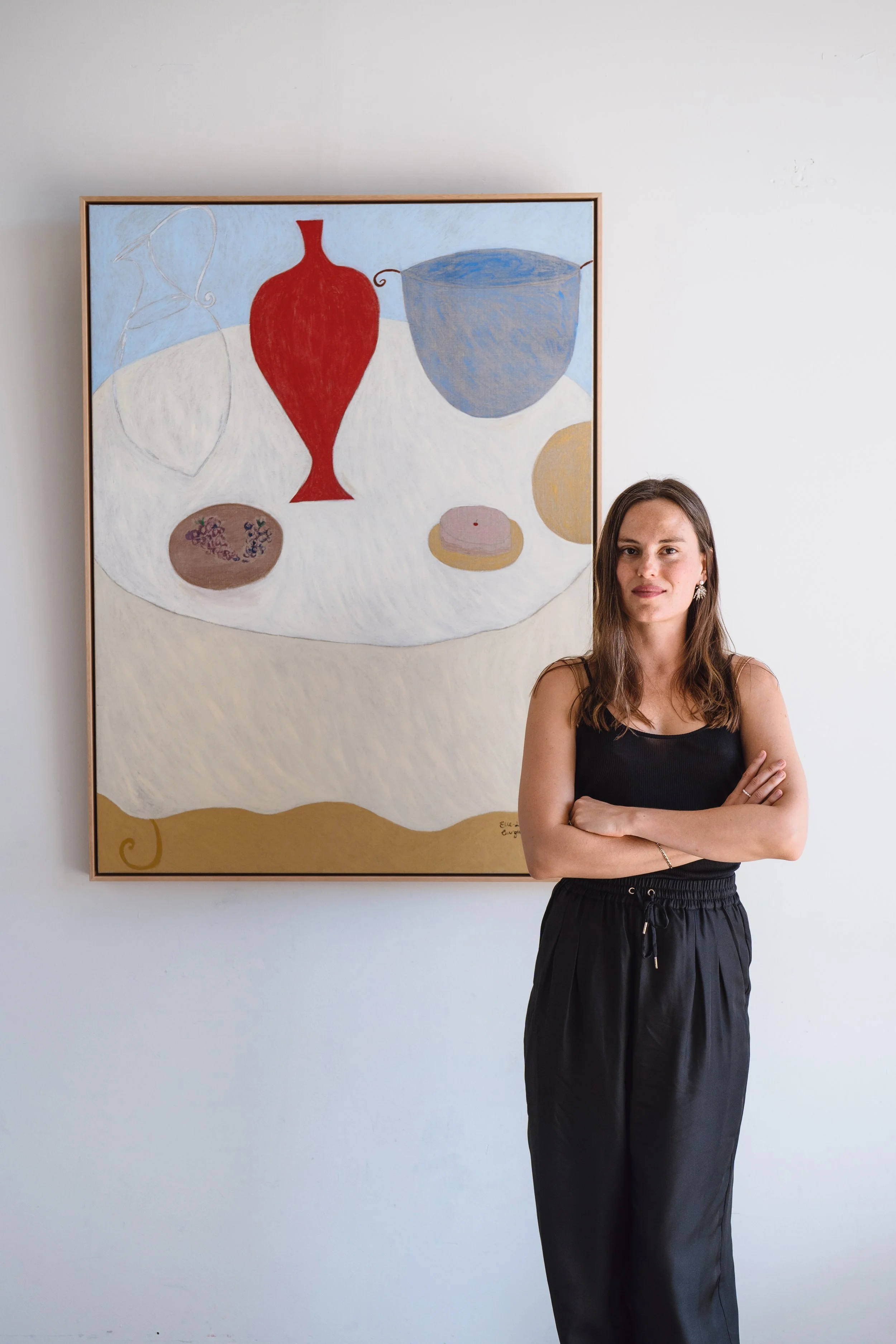 Elle paints vibrant and simple dreamscapes portraying a sense of holiday-moods, European summers and romantic evenings. Her paintings boast various vessels, fruits, desserts, tables, objects and rugs.
